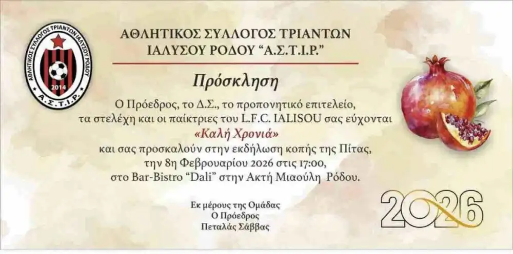 - Σήμερα στις 17:00 η L.F.C. Ιαλυσός θα κόψει την πίτα της στο Bar-Bistro “Dali”